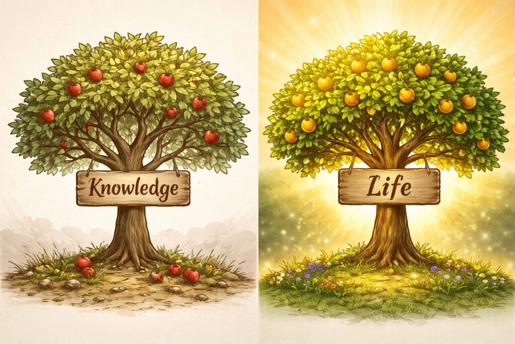 But I want you to notice something most people miss. The Tree of Knowledge was the knowledge of both Good and Evil. People have a conscience. While they often don’t follow it, they have some recognition of right and wrong. And when they choose to do right, it is often centered on self rather than simply because it is right. They choose the good of the tree, but it is still the same tree. Think about it.